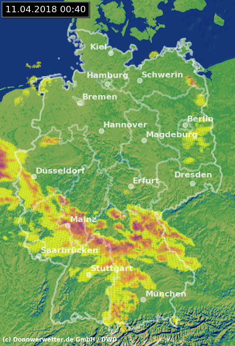 Das Radarbild zeigt aktuell von Bayern bis ins Rheinland teils stärkere Signale mit Regen. Vereinzelt blitzt und donnert es auch noch. Im Norden erkennt man nur einzelne Schauerechos. Sonst präsentiert sich der Himmel über Deutschland teils bewölkt, teils aufgeklart.