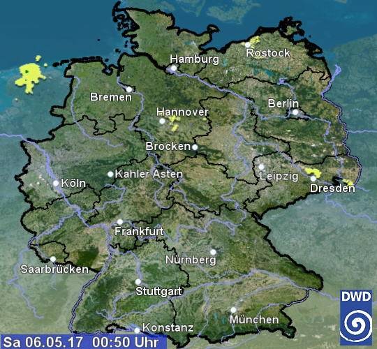 Das Radarbild zeigt aktuell nur noch ganz vereinzelt schwache Signale an. Um Dresden herum fällt noch ein wenig Regen. Sonst ist der Himmel im Nordosten noch wolkenverhangen, in der Südwesthälfte jedoch vielfach klar, oder nur leicht bewölkt.