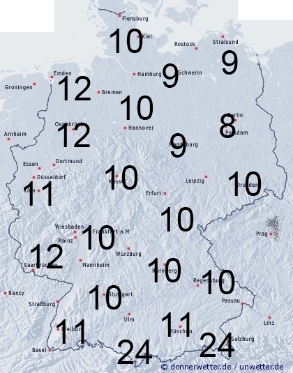 Im Westen und Nordwesten ist gelegentlich mit Regen zu rechnen. Im Süden kann es nachmittags zu örtlichen Schauern kommen. Sonst entsteht Benetzung durch nächtlichen Strahlungstau oder Reif. Die Benetzungsdauer liegt in Deutschland allgemein zwischen 7 und 13 Stunden. Bei einer vorhandenen Schneedecke in den Bergen werden bis 24 Stunden erreicht.