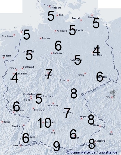 In Deutschland können vor allem in der Mitte und im Süden örtliche Schauer und Gewitter auftreten. Sonst entsteht leichte Benetzung durch nächtlichen Strahlungstau. Die Benetzungsdauer liegt allgemein zwischen 4 und 7 Stunden, bei Regengüssen können auch 7 bis über 10 Stunden erreicht werden.