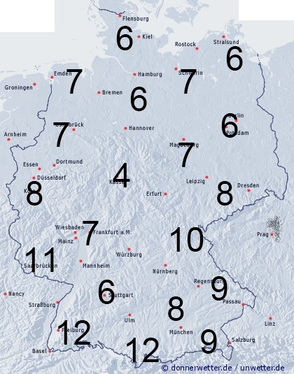 Von Weste nach Ost ziehen Regen und Schauer über Deutschland hinweg. Dabei erreicht die Benetzungsdauer meist zwischen 4 und 12 Stunden. Die höheren Werte findet man dabei im Südwesten und an den Alpen.
