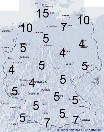In Schleswig Holstein, sowie im Küstenbereich gehen häufige Regengüsse nieder. Somit erreicht die Benetzungsdauer hier meistens zwischen 7 und 15 Stunden. Sonst entsteht Benetzung von 4 bis 7 Stunden nur durch Strahlungstau. Außerhalb von Ortschaften können die Werte aber deutlich nach oben abweichen.
