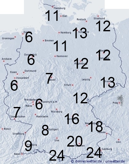 Vor allem in der Osthälfte fällt zeitweise Regen, darum ist hier die Benetzungszeit auch am größten. Im Westen fällt nur örtlich etwas Regen, oder es treten leichte Schauer auf. Sonst entsteht Benetzung auch durch nächtlichen Tauansatz. Die Benetzungsdauer liegt in Deutschland allgemein zwischen 6 und 14 Stunden, in Bayern bei längerem Regen meist zwischen 15 und 20 Stunden. Bei einer noch vorhandenen Schneedecke in den Bergen werden bis 24 Stunden erreicht.