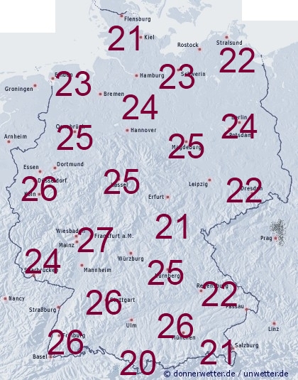 Die mittleren Temperaturen in 5 cm unterhalb des Erdbodens liegen jetzt in Deutschland in Folge der sommerlichen Temperaturen während der letzten Tage verbreitet schon über 20 Grad. Am wärmsten mit 26 bis 27 Grad ist es dabei den Rhein entlang, im Rhein-Main-Gebiet, sowie um München herum. Am kühlsten sind die Böden in den Hochlagen der Mittelgebirgen, sowie an den Alpen.