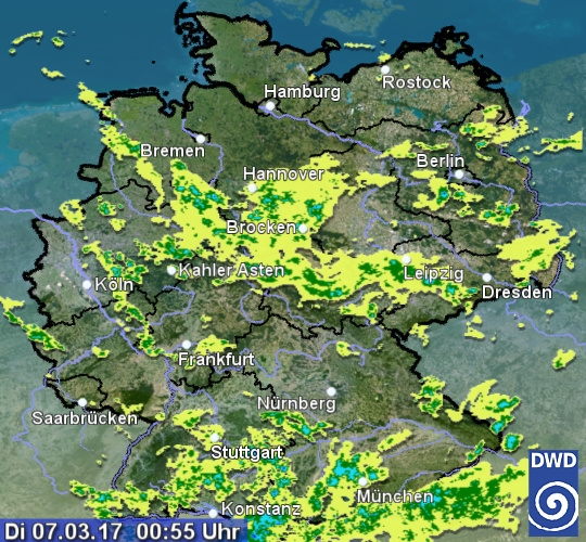 Vor allem über den Mittelgebirgen und in Süddeutschland erkennt man größere Niederschlagsechos. Die Schneefallgrenze pendelt momentan zwischen 600 und 800 m. Aber auch in den anderen Gebieten kann es nachts noch einzelne Schauer geben.
