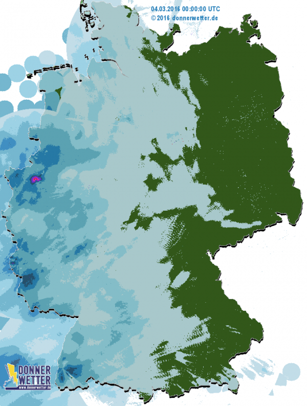 Gestern fielen im Westen 20-30 l/m2 an Schnee und Regen. Ab 300-400 m war es teilweise Schnee. Die östlichen Bundesländer blieben trocken. Heute könnte es ähnlich laufen.