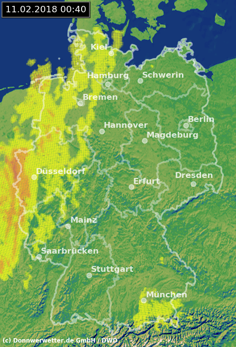 Das Radarbild zeigt aktuell im Westen bereits leichte bis mäßige Signale einer Störungsfront mit Schnee oder Schneeregen, die unser Land überqueren wird. Dabei muss verbreitet mit Straßenglätte gerechnet werden. In Südbayern erkennt man schwache Signale mit leichtem Schneefall. Sonst ist der Himmel über Deutschland meistens wolkenverhangen, nur selten zeigen sich einige Sterne. Vereinzelt haben sich Nebelfelder gebildet.