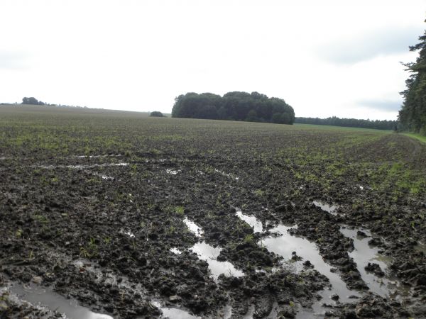 Viele Landwirte hoffen jetzt auf eine längere trockene Phase, um die Frucht von den Feldern zu bringen. Die wird es allerdings nicht geben. Nässe überall, wo man hinschaut, wie auf diesem Feld bei Bonn.