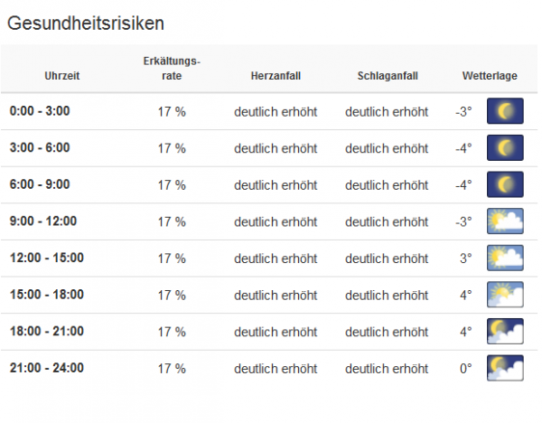 Seit Jahren ist bekannt, dass atmosphärische Veränderungen zu einer Häufung von Schlaganfällen und Herzinfarkten führen können. Insbesondere bei schnellen Änderungen von Temperaturen kommt es einem Anstieg von Fällen bei Risikopatienten. Besonders Menschen mit Vorerkrankungen sind betroffen. Das Wetter ist allerdings nicht die Ursache des Herz- Kreislaufproblems, sondern Vorschädigen zusammen mit Wetterstress führen zum akuten Auslösen des Herzinfarktes oder Schlaganfalles.