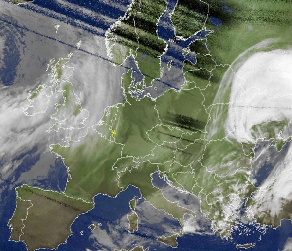Auf dem Satellitenbild von heute Morgen erkennen wir einen ausgedehnten Tiefausläufer über den Britischen Inseln, er gehört zu einem kräftigen Sturmtief über dem Nordatlantik und bringt auch im Süden Norwegens und in Nordfrankreich nasses und kühles Wetter.
