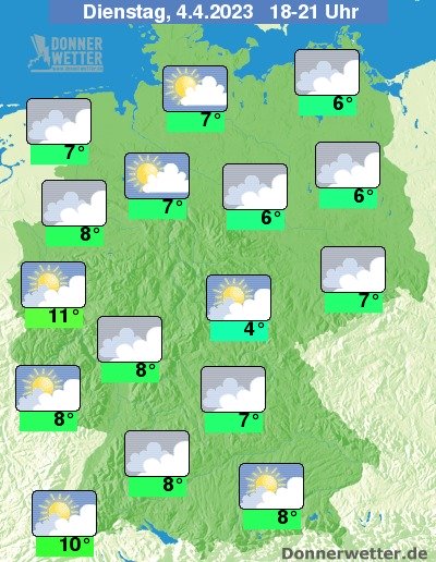 Heute Abend zeigt sich das Wetter teils stark, teils locker bis aufgelockert bewölkt. Bei Werten von 4 Grad in Jena und 11 Grad in Bonn bleibt es landesweit trocken.