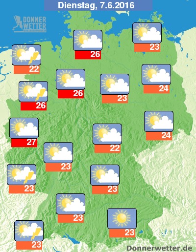 Am Dienstag ist es zunächst verbreitet heiter oder auch sonnig und noch überall trocken. In den westlichsten Landesteilen ziehen im Tagesverlauf jedoch zunehmend auch dichte Quellwolken auf, dabei sind hier einzelne Schauer und auch örtliche Gewitter möglich. Im übrigen Bundesgebiet ziehen auch hier und da mehr Wolken auf, das Gewitterrisiko bleibt jedoch vergleichsweise gering. Die Temperatur steigt auf 22 Grad im Grabfeld und bis auf teils schwülwarme 27 Grad in Köln.