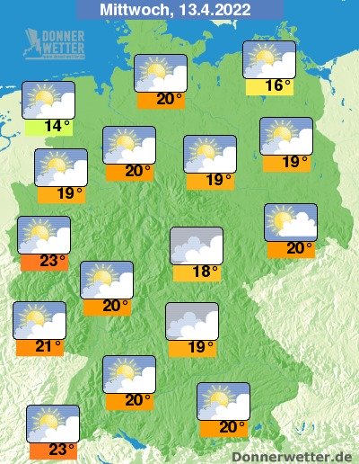 Am Mittwoch zeigen sich häufig heitere Abschnitte, gebietsweise ziehen aber auch dichtere Wolken durch, dabei bleibt es trocken. Die Temperatur steigt auf 14 Grad an der Nordsee und bis 23 Grad am Rhein.