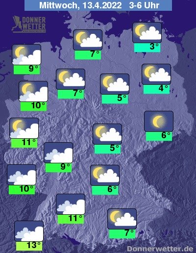 In der folgenden Nacht ist der Himmel vor allem über der Osthälfte Deutschlands meist locker bewölkt. Weiter nach Westen hin halten sich häufig auch dichte Wolken, teils ist es hier aber auch aufgelockert bewölkt. Es bleibt trocken bei Tiefstwerten von 13 Grad im Breisgau und bis 3 Grad an der Müritz.