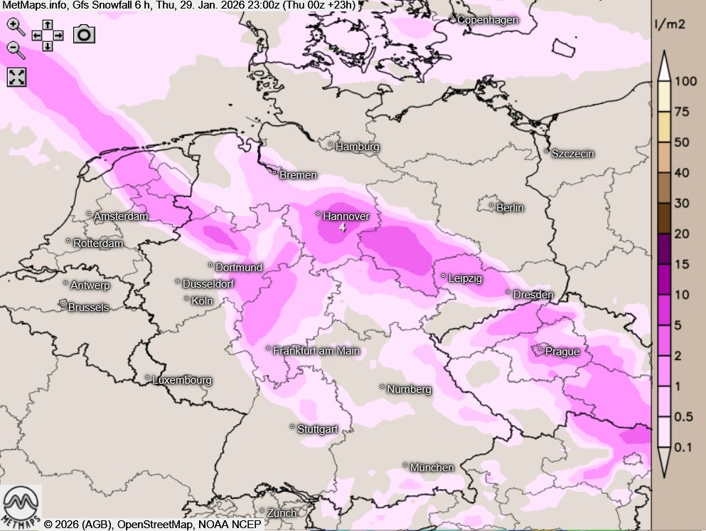 Die Wetter- und Temperaturkarte für 16:00 Uhr sowie die Sechs-Stunden-Schneemengen bis (17:00 - 23:00 Uhr) nach GFS: