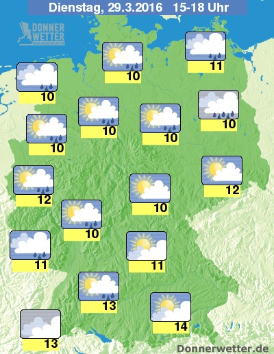 Heute Nachmittag halten sich vor allem im Norden meist dichte Wolken aus denen immer wieder Regen fällt, aber auch sonst ist es oft stark, gebietsweise jedoch auch aufgelockert bewölkt, dabei bilden sich einzelne Schauer. Die Temperatur steigt auf 10 Grad im Thüringer Becken und bis 14 Grad in München.