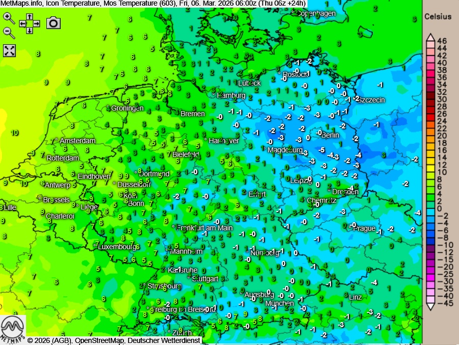 Die Temperatur- und Wetterkarte für Freitag (06:00 Uhr) nach ICON: