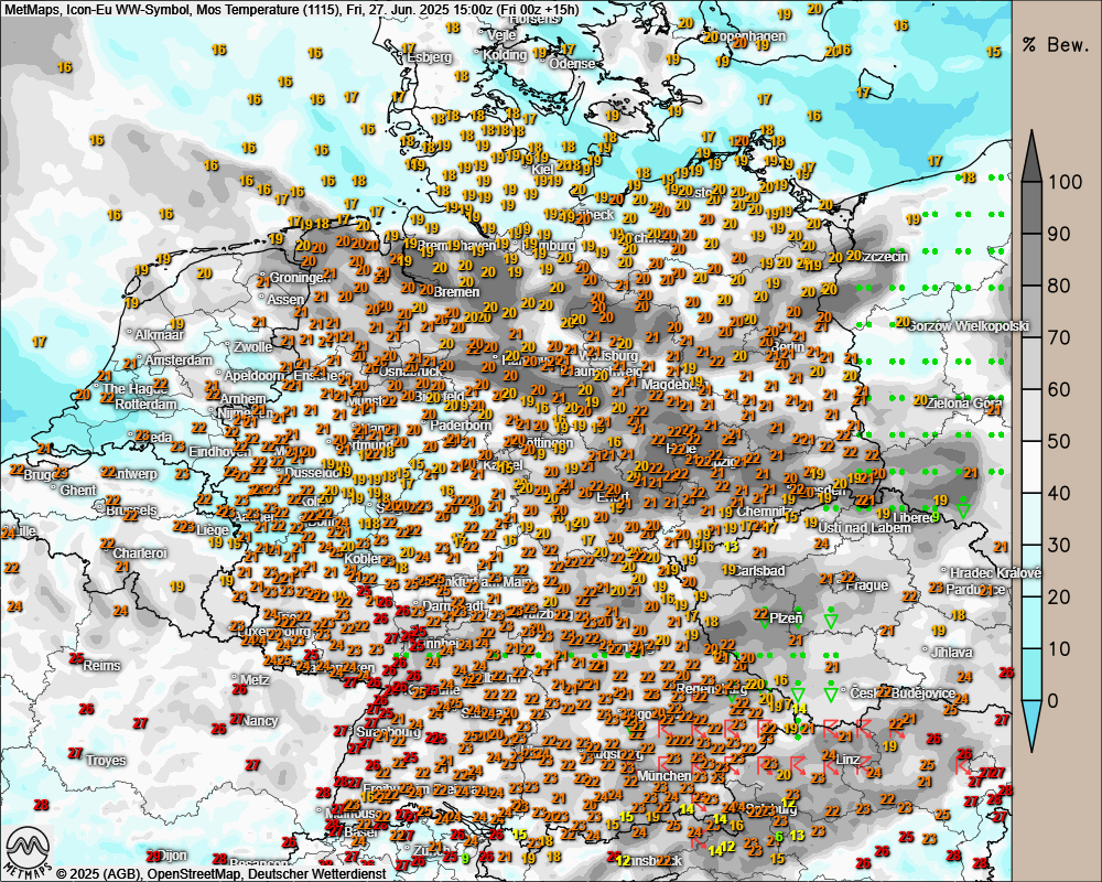 Am Freitagnachmittag zeigt sich der Himmel über weiten Landesteilen wechselnd oder stark bewölkt; dabei zieht letzter Regen nach Osten hin ab. Im Westen lockern die Wolken am Nachmittag zunehmend auf. Es bleibt meist trocken, vor allem im Südosten sind lokale Schauer und Gewitter aber möglich.