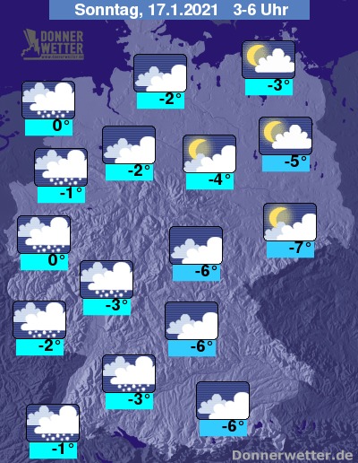 In der Nacht zum Sonntag ziehen von Westen her kompakte Wolken mit Schneefällen herein, die sich bis zum Morgen hin etwa über die Westhälfte und den kompletten Süden ausbreiten. Im Osten und Nordosten bleibt es stark, teils aufgelockert bewölkt und dazu trocken. Die Temperatur sinkt auf 0 Grad entlang des Rheins und bis -7 Grad in der Lausitz.
