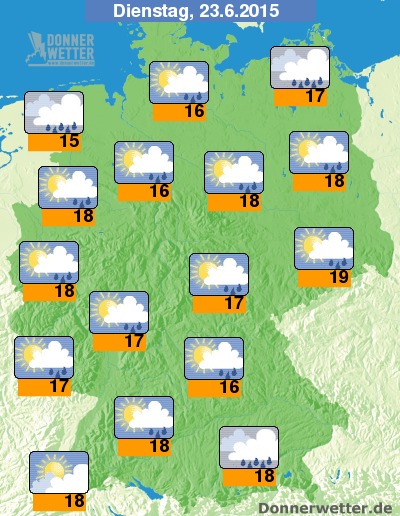 Am Dienstag ist es anfangs oft locker oder aufgelockert bewölkt und es bilden sich nur vereinzelt Schauer, im weiteren Verlauf ziehen aber zunehmend auch dichte Wolken auf und es bilden sich zeitweise Schauer, gebietsweise entwickeln sich auch Gewitter. Die Temperatur steigt auf 15 Grad an der Nordseeküste und bis 19 Grad in Dresden.