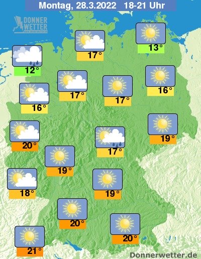 Heute Abend zeigt sich das Wetter überwiegend heiter oder sonnig, an der Nordsee sowie über Thüringen sind gebietsweise jedoch dichte Wolken möglich, dazu bilden sich auch örtliche Schauer, sonst bleibt es weitgehend trocken. Die Temperatur liegt bei 12 Grad in Wilhelmshaven und bis 21 Grad in Freiburg.