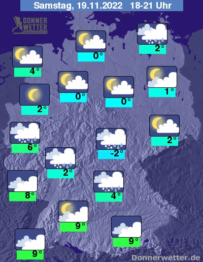 In der Nacht zum Sonntag fällt im Süden unter dichten Wolken zeitweise Regen, Schneeregen oder Schnee. Auch im Ostseeumfeld bleibt es meist bedeckt und hier und da ist etwas Schneefall möglich. Im Osten ist es teils stark, teils aufgelockert bewölkt und trocken, sonst ist es meist locker bewölkt oder sternenklar und ebenfalls trocken. Die Temperatur sinkt auf 6 Grad in Freiburg und bis auf eisige -10 Grad in Jena.