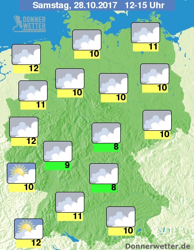 Heute Nachmittag halten sich über dem Land dichte Wolken, dazu bleibt es überwiegend trocken, im weiteren Verlauf zieht aber von Norden her Regen auf. Im Südwesten kann sich zwischen den Wolken die Sonne hier und da mal zeigen. Die Temperatur liegt bei 8 bis 12 Grad. An den Küsten und auf den Bergen der Norddeutschen Mittelgebirge herrscht zunehmend Sturm, im übrigen Norden ist es teils stürmisch.