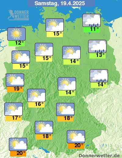 Am Karsamstag bleibt es vor allem im Osten und Nordosten, aber auch im Norden oft stark bewölkt und es fällt zudem etwas Regen. Im übrigen Land zeigt sich immer wieder die Sonne, teilweise ziehen aber auch einige Wolken durch, dabei bleibt es trocken. Die Höchstwerte erreichen 11 Grad in Vorpommern und bis 20 Grad am Oberrhein.