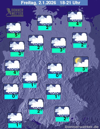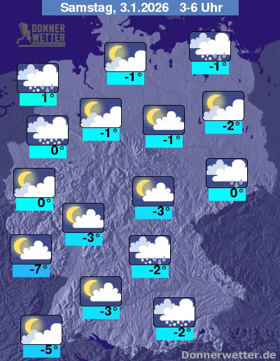 In der Nacht zum Samstag zeigt sich der Himmel im Nordwesten, Nordosten und Südosten Deutschlands eher bedeckt, hier fällt häufiger Schnee, zum Teil auch noch Schneeregen. Im übrigen Land ist es auch oft nur leicht bis wechselnd bewölkt und Schneefälle sind insgesamt deutlich seltener. Die Tiefstwerte liegen bei 1 Grad an der Nordsee und bis -7 Grad am Pfälzer Wald.