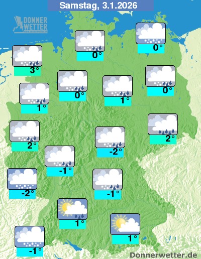 Am Samstag zeigt sich der Süden oft heiter und trocken. Im übrigen Bundesgebiet zieht hingegen oft starke, zum Teil auch noch aufgelockerte Bewölkung durch, dabei bilden sich gebietsweise Schneeschauer, zum Teil mischt sich auch Regen oder Schneeregen in die Niederschläge. Die Höchstwerte liegen bei -2 Grad im Eichsfeld und bis 3 Grad an der Elbmündung. An der See weht ein oft stürmischer Wind.