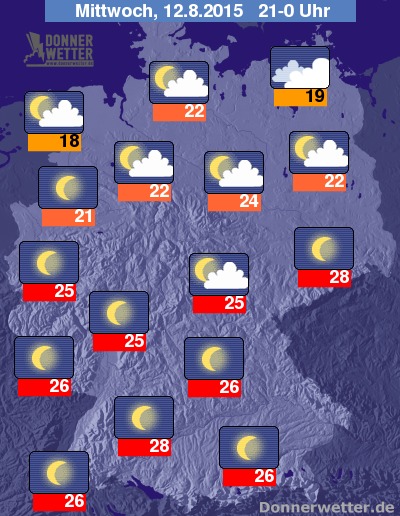 In der Nacht zum Donnerstag zeigt sich der Himmel zum größten Teil sternenklar, besonders in den westlichsten Landesteilen und gebietsweise im Süden können aber auch lockere Wolken durchziehen, dazu bleibt es jedoch trocken. Die Temperatur sinkt auf 19 Grad entlang des Ober- und Mittelrheins und auf etwa 14 Grad an der Müritz.