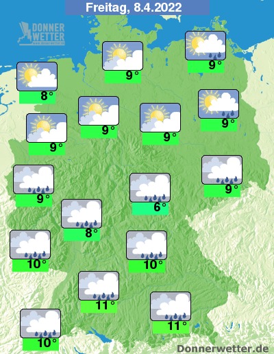Am Freitag bleibt es über der Südhälfte Deutschlands bedeckt und dazu regnerisch, zum Teil mischen sich auch Flocken mit in den Niederschlag. Im Norden ist es hingegen oft locker bewölkt, im übrigen Land meist dicht bewölkt, jedoch trocken. Die Temperatur steigt auf 6 Grad in Erfurt und bis 11 Grad in Stuttgart. An den Küsten weht ein oft stürmischer Wind.