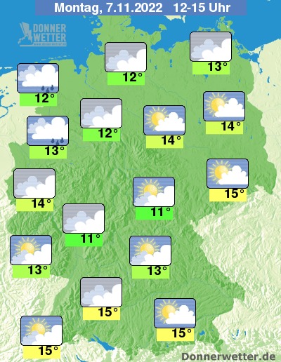 Heute Nachmittag zeigt sich das Wetter überwiegend trüb oder stark bewölkt, gebietsweise kann es aber auch auflockern. Im Nordwesten fällt hier und da etwas Regen, während es sonst trocken bleibt. Die Temperatur liegt bei 11 Grad im Grabfeld und 15 Grad in Schwaben. An den Küsten weht ein oft stürmischer Wind.