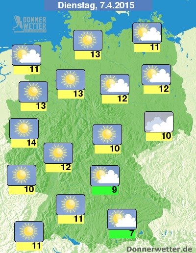 Am Dienstag halten sich im Osten und Südosten häufig dichte Wolken, teils ist es aber auch hier aufgelockert bewölkt, dazu bleibt es trocken. Im großen Rest des Landes ist es verbreitet heiter bis sonnig und trocken. Vor allem im Küstenumfeld können aber auch mal dichtere Wolken durchziehen. Die Temperatur steigt auf 7 Grad in Oberbayern und bis 14 Grad in der Kölner Bucht.
