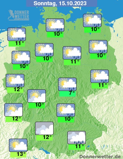 In der Nacht zum Sonntag ist es am Alpenrand und an der See bedeckt. An den Alpen fällt etwas Regen, an der See bilden sich teils kräftige Schauer oder sogar einzelne Gewitter. Die Schauerfront bewegt sich bis zum Morgen auch in den übrigen Norden und den Westen des Landes, sonst bleibt es trocken. Die Temperatur sinkt auf 9 Grad in Stuttgart und 3 Grad in Erfurt.