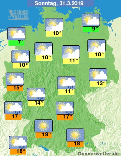 Am Sonntag bleibt es im Süden noch überwiegend heiter bis sonnig, im Norden ziehen zum Teil einige Wolken durch, teils zeigen sich hier auch heitere Abschnitte, dazu bleibt es trocken. Im übrigen Bundesgebiet ist es hingegen oft stark, teils aufgelockert bewölkt, dabei sind einzelne Schauer möglich. Die Temperatur steigt auf teils nur 7 Grad an der Nordsee und bis 18 Grad in Stuttgart.
