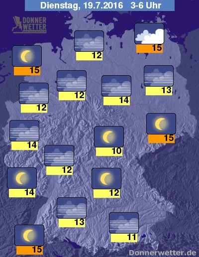 In der kommenden Nacht sind im Ostseeumfeld dichte Wolken möglich, dabei bleibt es aber weitgehend trocken. Im übrigen Bundesgebiet zeigt sich der Himmel verbreitet sternenklar und es bleibt trocken. Die Temperatur sinkt auf 15 Grad in Rostock und bis 10 Grad im Grabfeld.