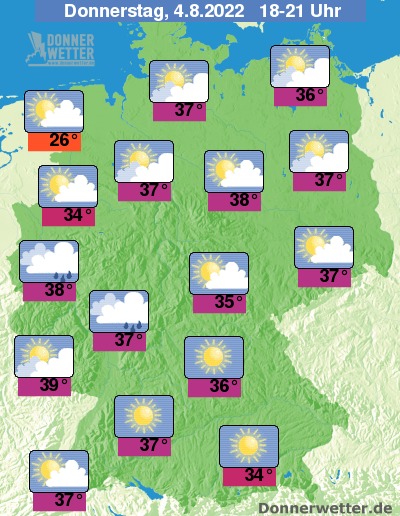 Heute Abend ist es über dem Süden verbreitet sonnig. Im Westen ziehen zum Teil dichte Quellwolken auf und es besteht ein leichtes Schauer- und Gewitterrisiko. Im übrigen Land ist es überwiegend heiter, teils auch aufgelockert bewölkt, jedoch trocken. Die Temperatur liegt bei noch angenehmen 26 Grad in Wilhelmshaven und extrem drückenden 39 Grad in Saarbrücken.