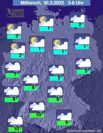 Am Mittwoch ist es verbreitet stark bewölkt oder bedeckt, dabei bilden sich im Süden vielerorts, über der Landesmitte vereinzelt Schauer. Weiter nach Norden hin bleibt es weitgehend trocken, hier sind auch einige Auflockerungen möglich. Die Temperatur steigt auf 6 Grad in Rostock und bis 13 Grad in München.