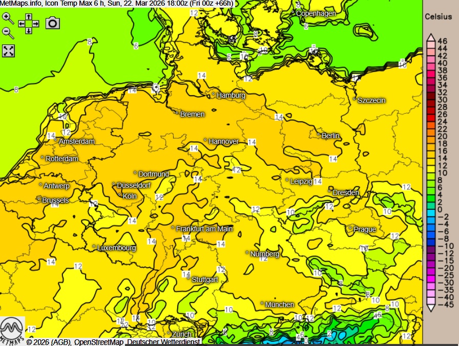 Die Wetterkarte für Sonntagfrüh, die Sechs-Stunden-Höchsttemperaturen bis 18:00 Uhr sowie die Sonnenscheindauer für Sonntag nach ICON: