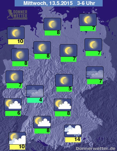 In der bevorstehenden Nacht bilden sich im Süden, Südosten und Osten noch zeitweilige Schauer und auch einzelne Gewitter, sonst lockert die Bewölkung aber verbreitet auf und es wird zumeist sternenklar, dazu bleibt es trocken. Die Temperatur sinkt auf milde 14 Grad in München und bis 4 Grad am Odenwald. Stellenweise bildet sich Nebel oder Dunst.