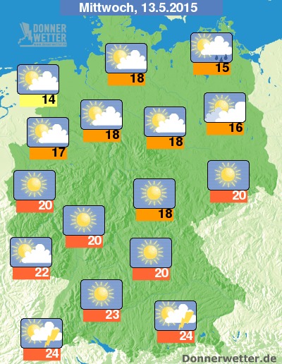 Am Mittwoch fällt im Süden bei oft starker Bewölkung zeitweilig Regen, am Nachmittag bilden sich hier mögliche Schauer und Gewitter. Im übrigen Bundesgebiet ist es dagegen verbreitet sonnig oder es ziehen nur lockere Wolken durch, dabei bleibt es trocken. Im Küstenumfeld können dichte Wolken jedoch für einzelne Schauer sorgen. Die Temperatur steigt auf kühle 14 Grad in Ostfriesland und bis auf schwülwarme 24 Grad am Bodensee.