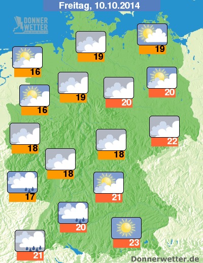 Am morgigen Freitag lässt der nach Südosten ziehende Regen meist rasch nach, jedoch bilden sich vom Oberrhein und vom Saarland ostwärts, über das nördlichen Baden-Württemberg und das nördliche Bayern im Tagesverlauf Schauer und Gewitter, südlich und nördlich davon bleibt es weitgehend trocken, nach Süden hin auch vielfach heiter, nach Norden hin bleibt es jedoch meist stark, teils aber auch aufgelockert bewölkt. Die Temperatur steigt auf 16 Grad an der Ems und bis 23 Grad in Oberbayern.