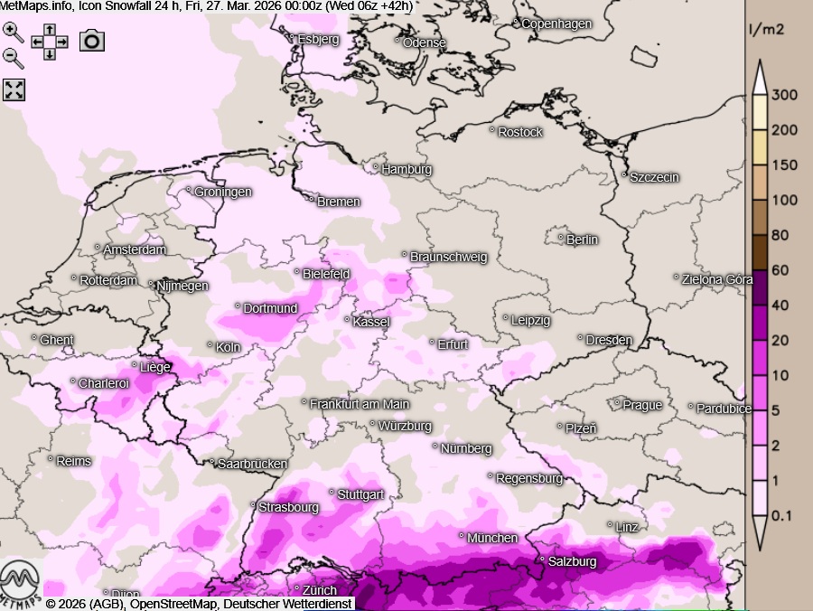 Die Wetter- und Temperaturkarte für Donnerstag (12:00 / 15:00 Uhr) sowie die 24-Stunden-Schneemengen für Donnerstag nach ICON: