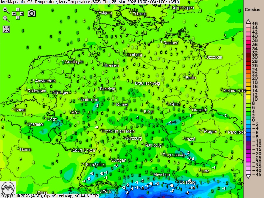 Die Temperaturen erreichen heute Höchstwerte um 3 Grad an den Alpen und um 9 Grad am Stettiner Haff.