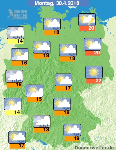 Zunächst im Nordwesten, später auch im Nordosten wechselnde bis starke Bewölkung mit teils schauerartigen Regenfällen und einzelnen, teils kräftigen Gewittern. Dabei vor allem Gefahr von Starkregen. In den übrigen Landesteilen Wechsel von aufgelockerter mit stärkerer Bewölkung mit ein paar Schauern, geringe Gewittergefahr. Höchstwerte im Osten und Südosten nochmals 18 bis 24 Grad, sonst 13 bis 20 Grad. Auch abseits von Gewittern verbreitet böig auffrischender Südwestwind mit starken, im Westen und Südwesten auch stürmischen Böen.