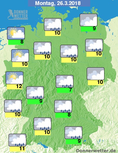 An Gründonnerstag gibt es wieder größere Aufheiterungen und Regen, oder Schauer konzentrieren sich oft nur auf kleinere Gebiete.