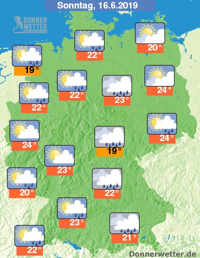 Heute ist es vor allem über der Westhälfte des Landes oft heiter, im übrigen Bundesgebiet ist es teils stark, teils aufgelockert bewölkt, dabei bilden sich besonders im Süden gebietsweise Schauer und Gewitter, aber auch sonst sind einzelne Schauer und Gewitter möglich. Die Temperatur erreicht 19 Grad am Thüringer Wald und bis 24 Grad in Berlin.