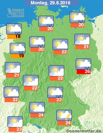 Heute ist es vor allem im Alpenvorland häufig stark bewölkt und es bilden sich zeitweise Schauer sowie teils kräftige Gewitter. In einem sehr breiten Streifen vom Südwesten bis in den Osten des Landes ist es verbreitet heiter oder aufgelockert bewölkt und weitgehend trocken. Dagegen ziehen nordwestlich einer Linie von südlichen NRW bis nach Nordbrandenburg oft auch dichte Wolken durch, die für einzelne Schauer sorgen. Die Temperatur steigt auf 18 Grad an der Nordsee und bis 26 Grad in der Lausitz.