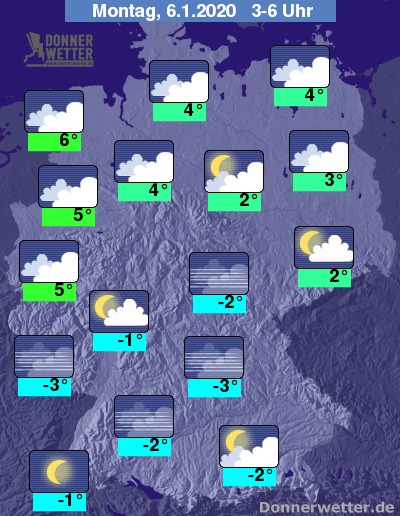 In der Nacht zum Montag zeigt sich der Himmel über der Nordhälfte Deutschlands verbreitet stark und nur hier und da auch mal aufgelockert bewölkt. Weiter nach Süden hin ist es meist sternenklar und sonst locker bewölkt, hier kann sich stellenweise Nebel bilden. Es bleibt landesweit trocken bei Tiefstwerten von 6 Grad in Wilhelmshaven und -3 Grad im Saargau.